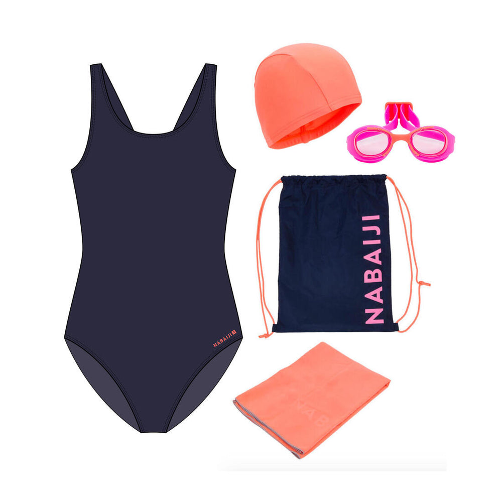 Este kit contiene los accesorios esenciales: bañador, gorro de tela, gafas y toalla M (65x90cm) para poder iniciarse en la práctica de la natación.