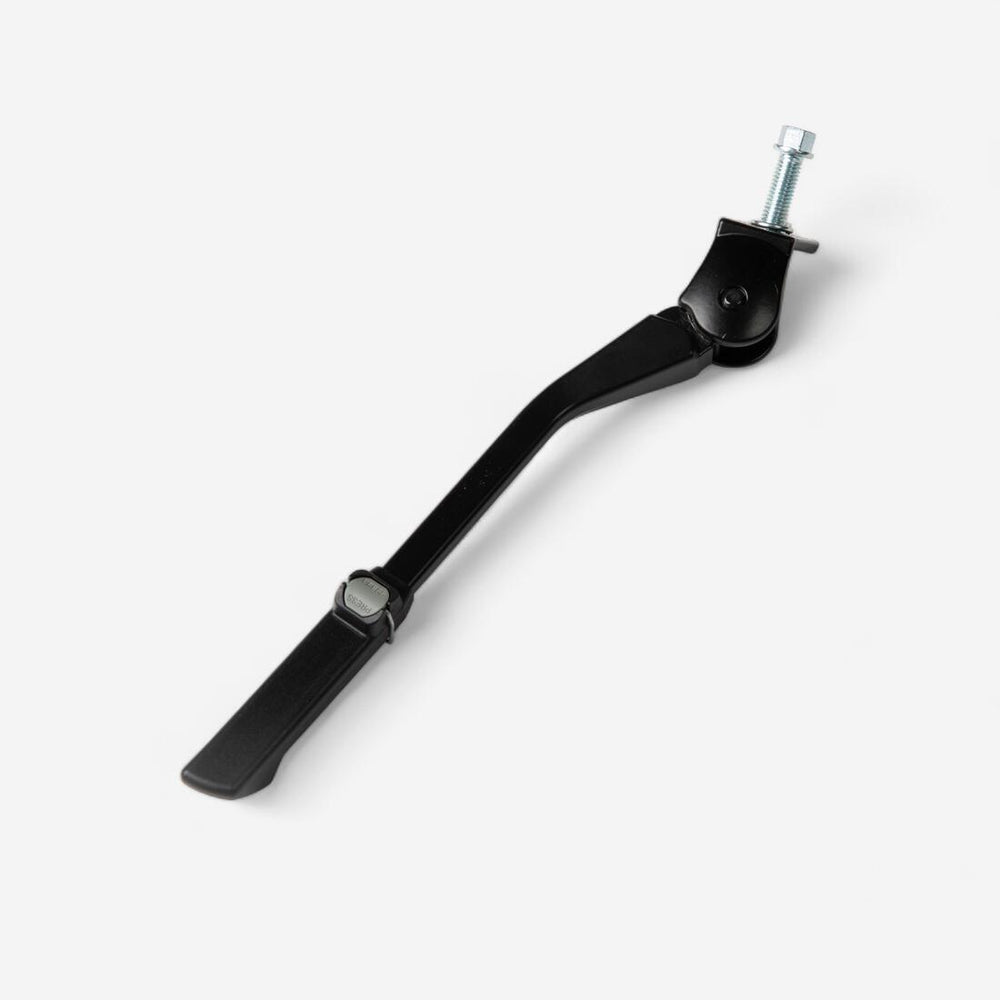 Fija el parador para bici plegable de 20 pulgadas bajo el cuadro. El botón facilita el ajuste de la longitud del parador para adaptarlo a diferentes terrenos y cargas, para una mayor estabilidad.