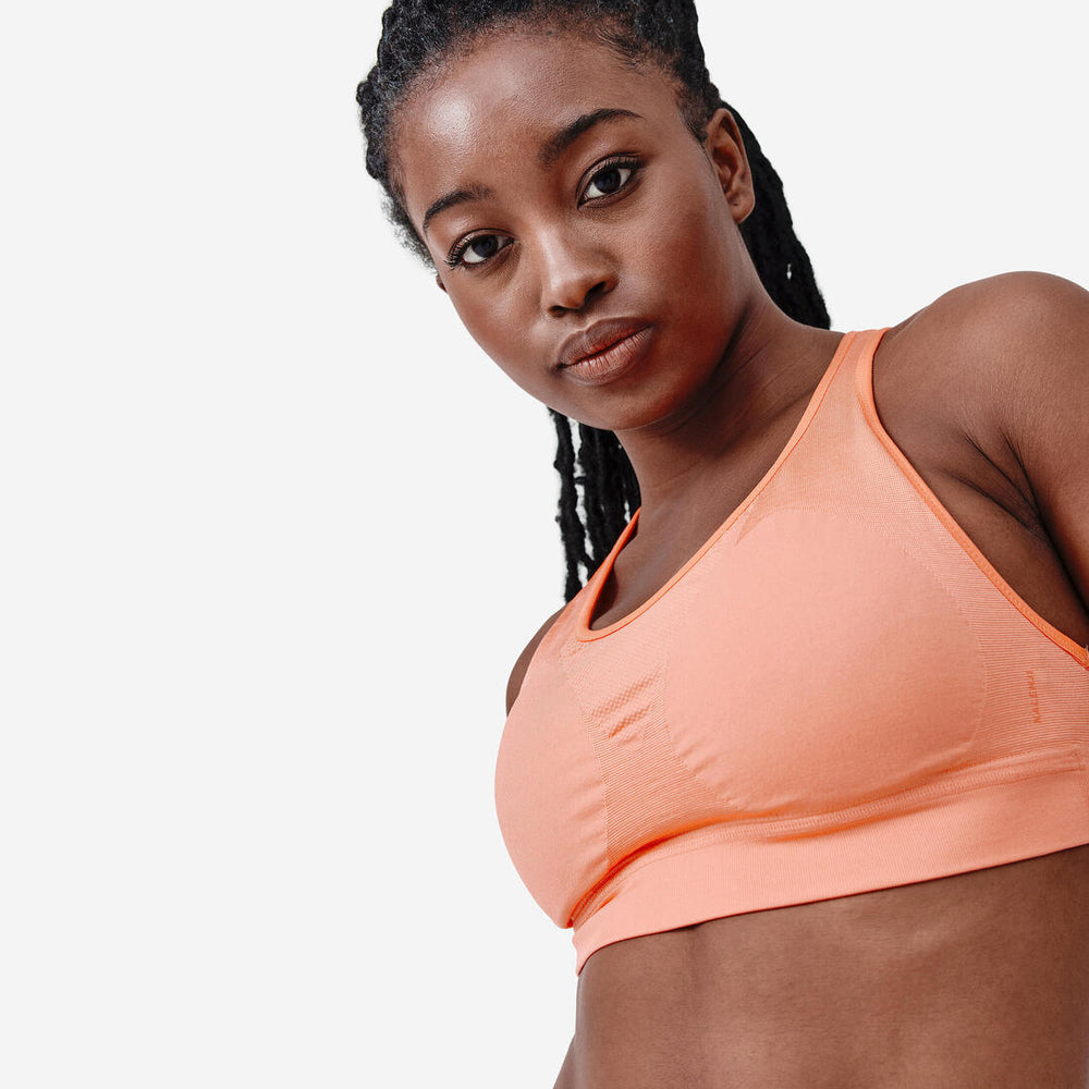 Brassiere-top de running transpirable, sin copa preformada y sin costuras. Sujeción adaptada a los impactos repetidos al correr.