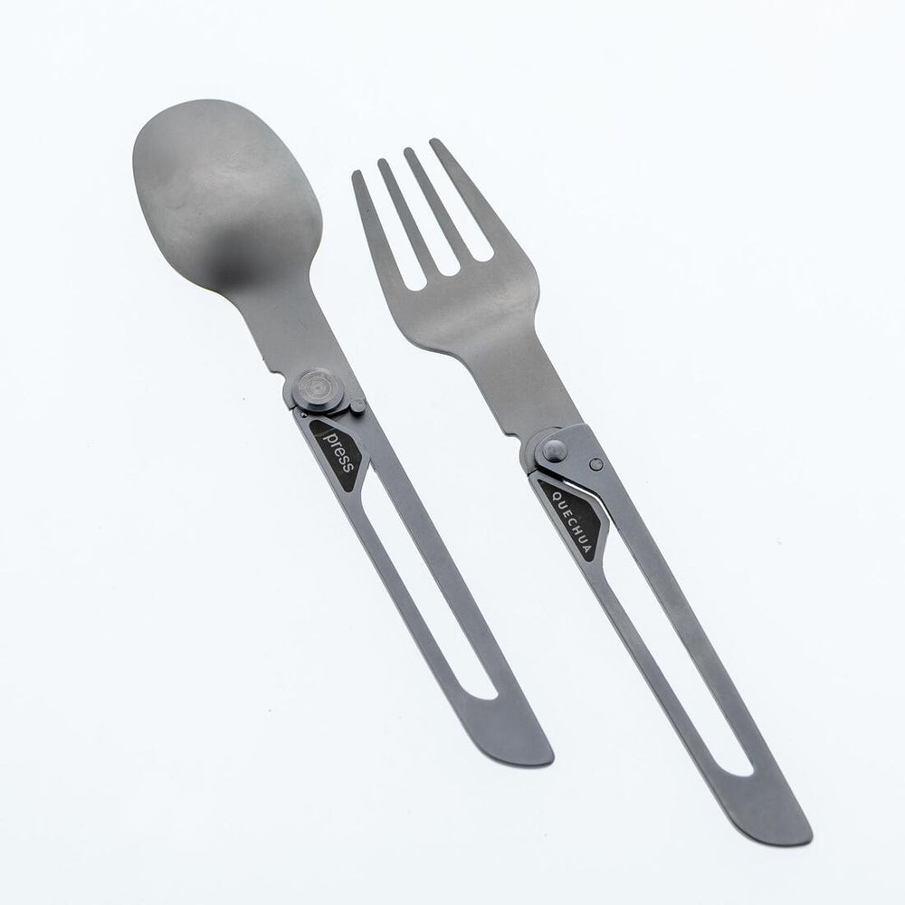 2 cubiertos (cuchara, tenedor) de acero inoxidable, muy resistentes y plegables. Se guardan fácilmente en su funda.