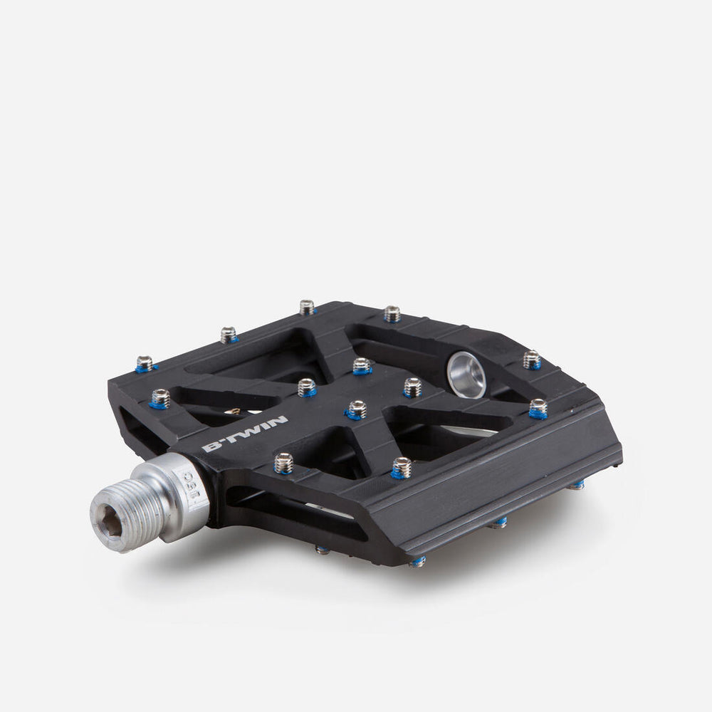 Gracias a la anchura y a las calas ajustables de nuestros pedales planos MTB 900 de aluminio, gana estabilidad y control en tu conducción, ¡y durante mucho tiempo!