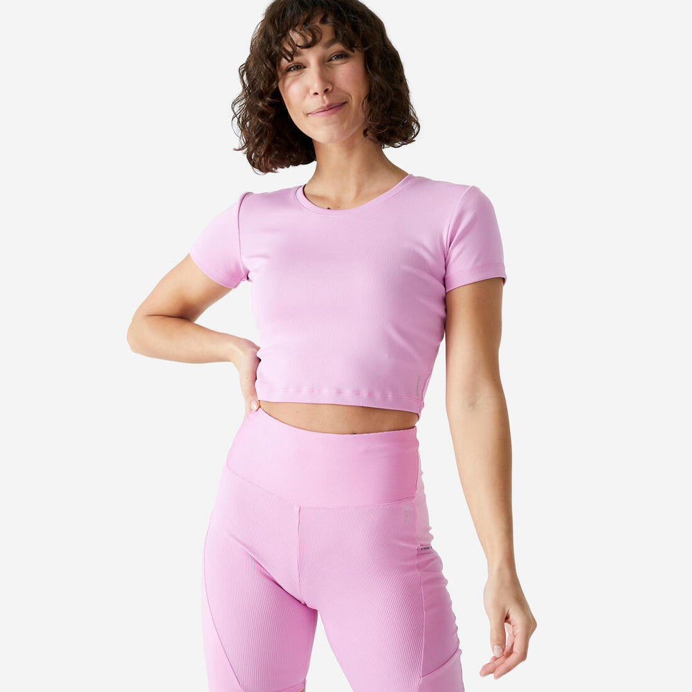 El diseño deportivo y estético de este crop top de manga corta y escote redondo realza tus curvas y hace lucir tu silueta. Consigue el look perfecto combinándolo con unas mallas de la misma gama.