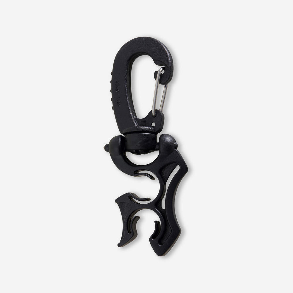 Este pequeño accesorio permite fijar dos latiguillos a una de las anillas del jacket para tenerlos al alcance de la mano en el triángulo de seguridad del buceador.