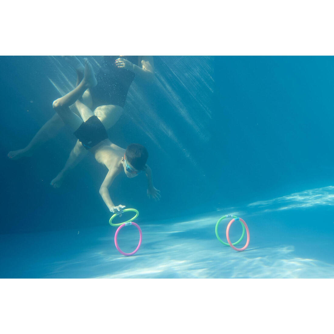 El niño lanza los anillos y estos se hunden en el fondo del agua, después debe recuperarlos aprendiendo a aguantar la respiración. Utilizar bajo la vigilancia de un adulto.