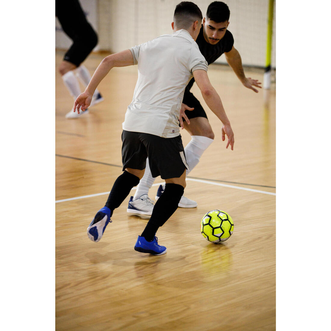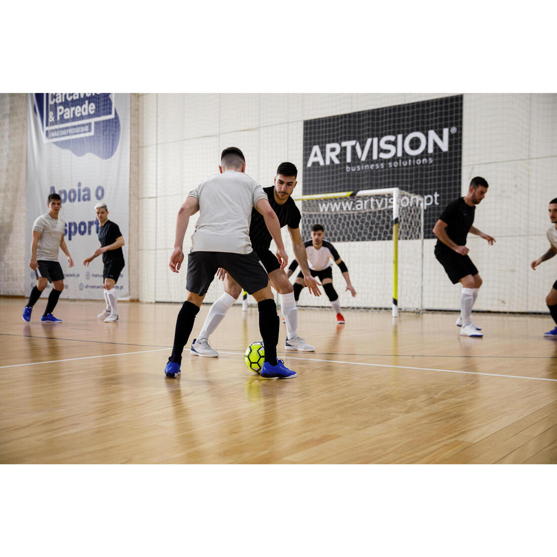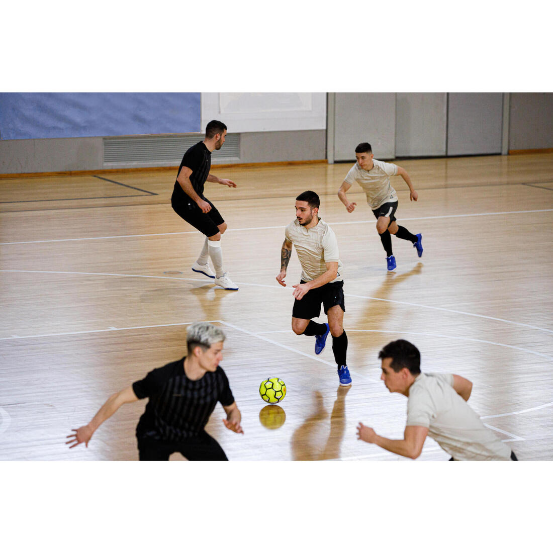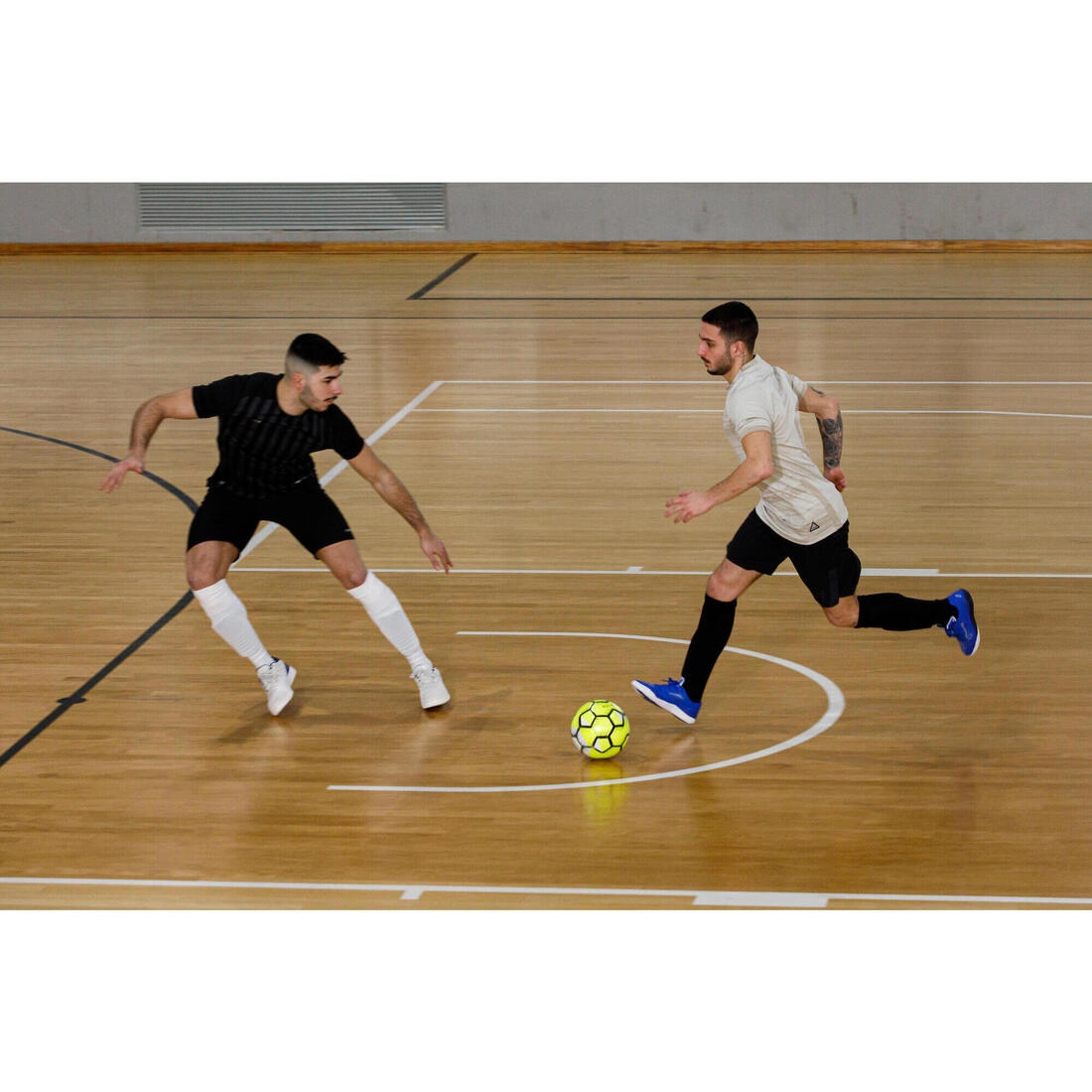 Desarrollamos este balón para jugadores de fútbol sala que practican tanto en parquet y PVC como en superficies más abrasivas (pavimento o cemento).
