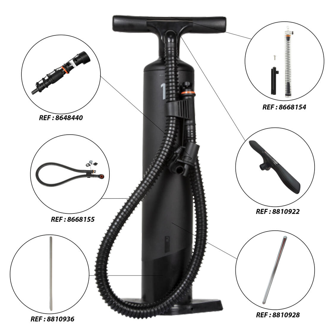 Además de la boquilla de base para inflar a alta presión canoas kayaks de drop stitch, la bomba incluye: - Una boquilla "mini boston" para inflar los asientos del kayak. - Una boquilla "boston" para inflar los kayaks a baja presión, los colchones y las casas inflables... - Un adaptador y una boquilla para inflar algunas alas de kitesurf. - Una boquilla delgada para las válvulas flexibles tipo "pato".