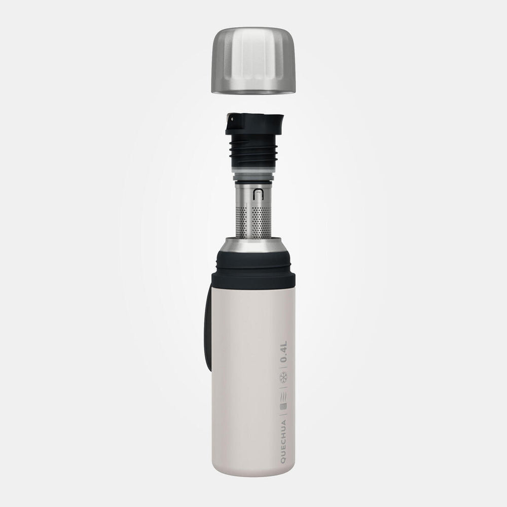 Muy aislante gracias a su construcción de acero inox doble pared, tapa de apertura rápida se abre con una sola mano e incluye filtro de té extraíble, vaso doble pared incluido, asa transporte / 0,4 L