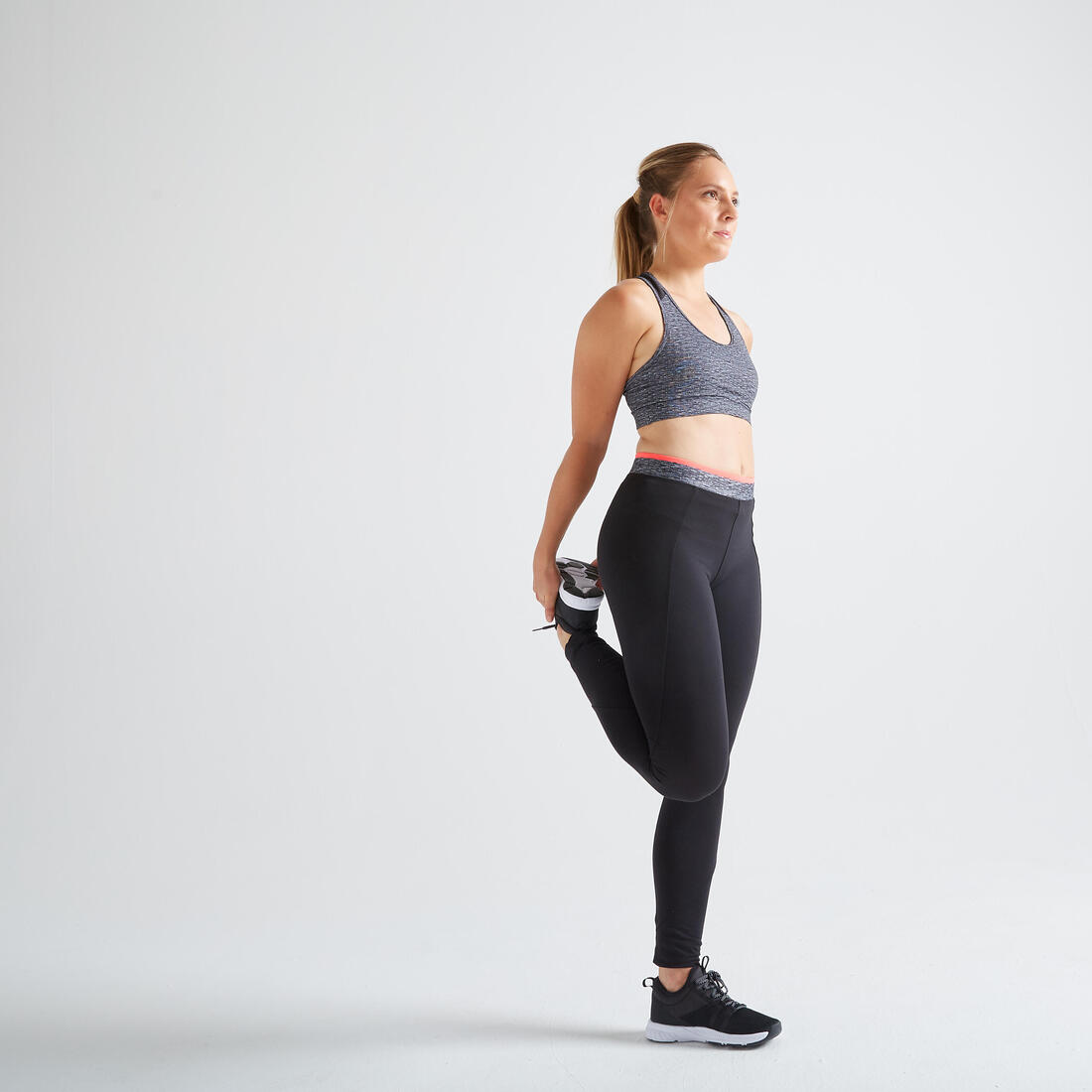 Poliéster y elastano: la combinación ganadora para el confort. El primero evacúa la sudoración para mantenerte seca. El segundo hace que el tejido sea más elástico para facilitar tus movimientos.