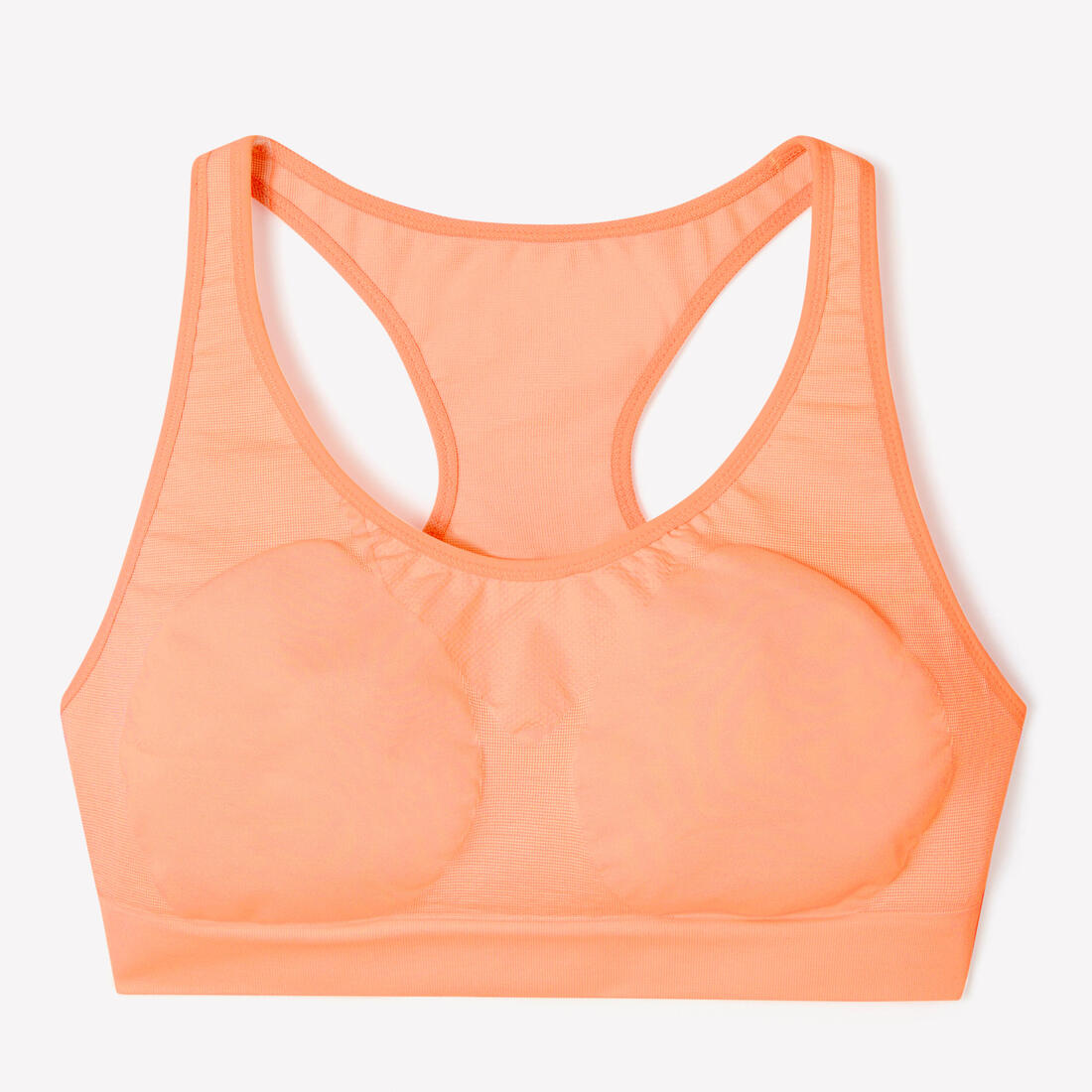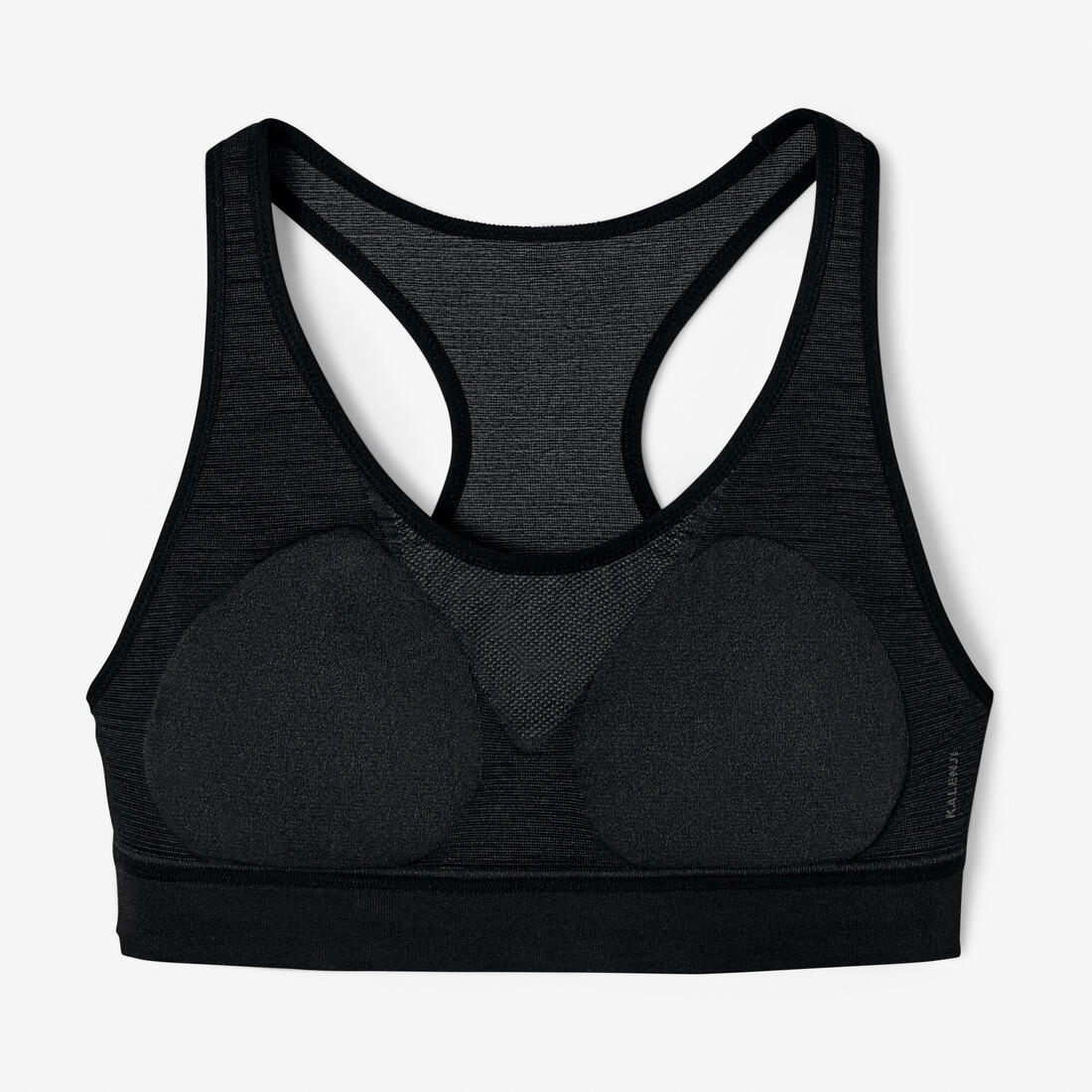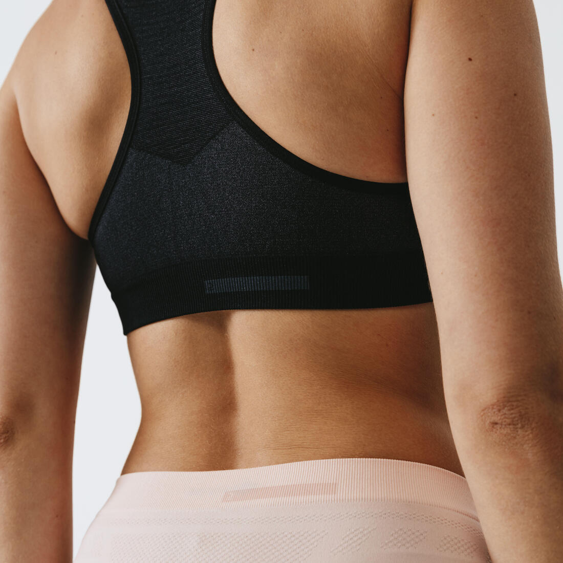 Brassiere-top de running transpirable, sin copa preformada y sin costuras. Sujeción adaptada a los impactos repetidos al correr.