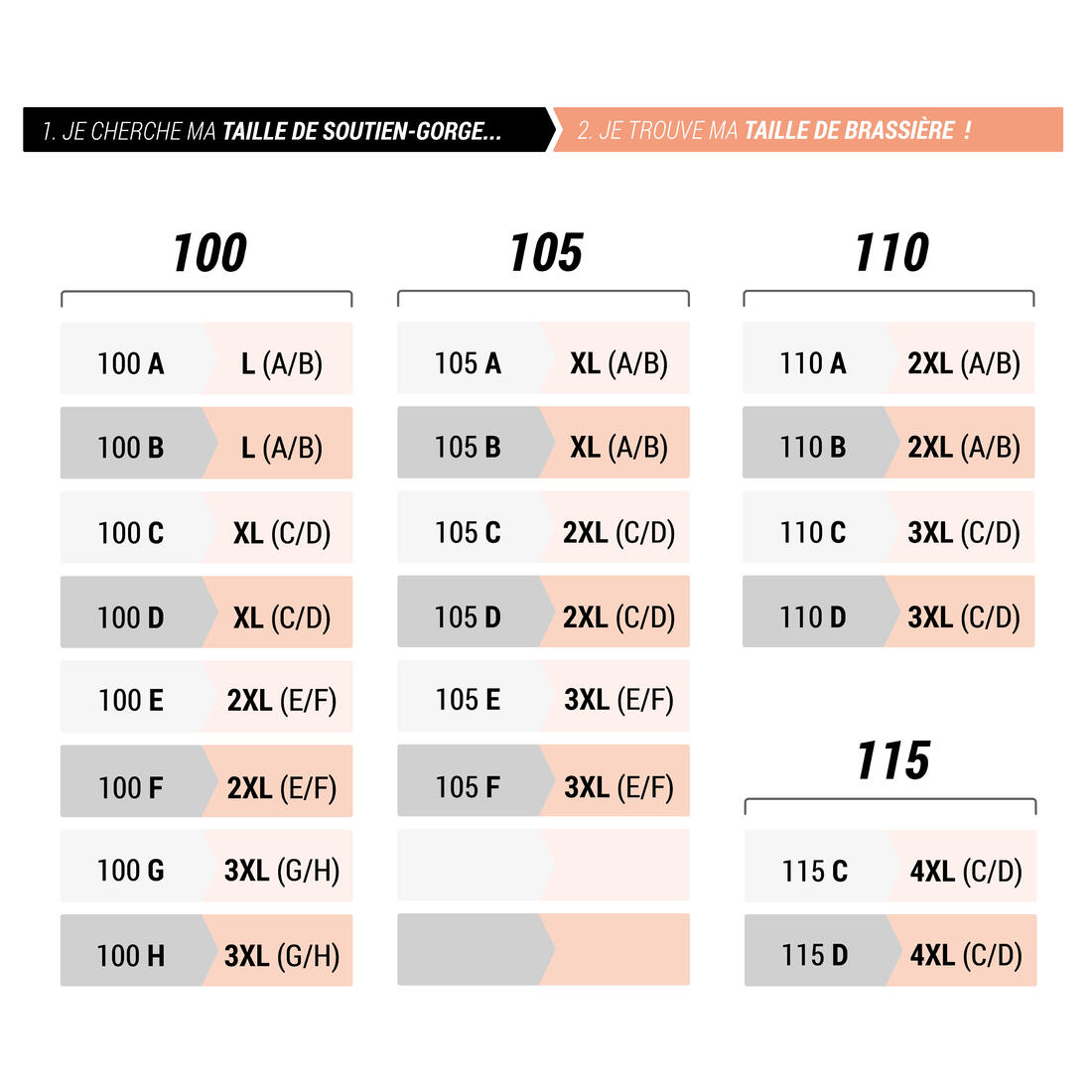 El brassiere-top Básico está disponible de la talla XCH a la XG, y se recomienda para las tallas hasta la copa B. La espalda estilo natación, típica de los tops deportivos, permite repartir la sujeción en la espalda. Para las copas a partir de la C, recomendamos los modelos BRASSIERE-TOP EASY CIERRE o BRASSIERE-TOP DE RUNNING CON COPA AJUSTABLE.