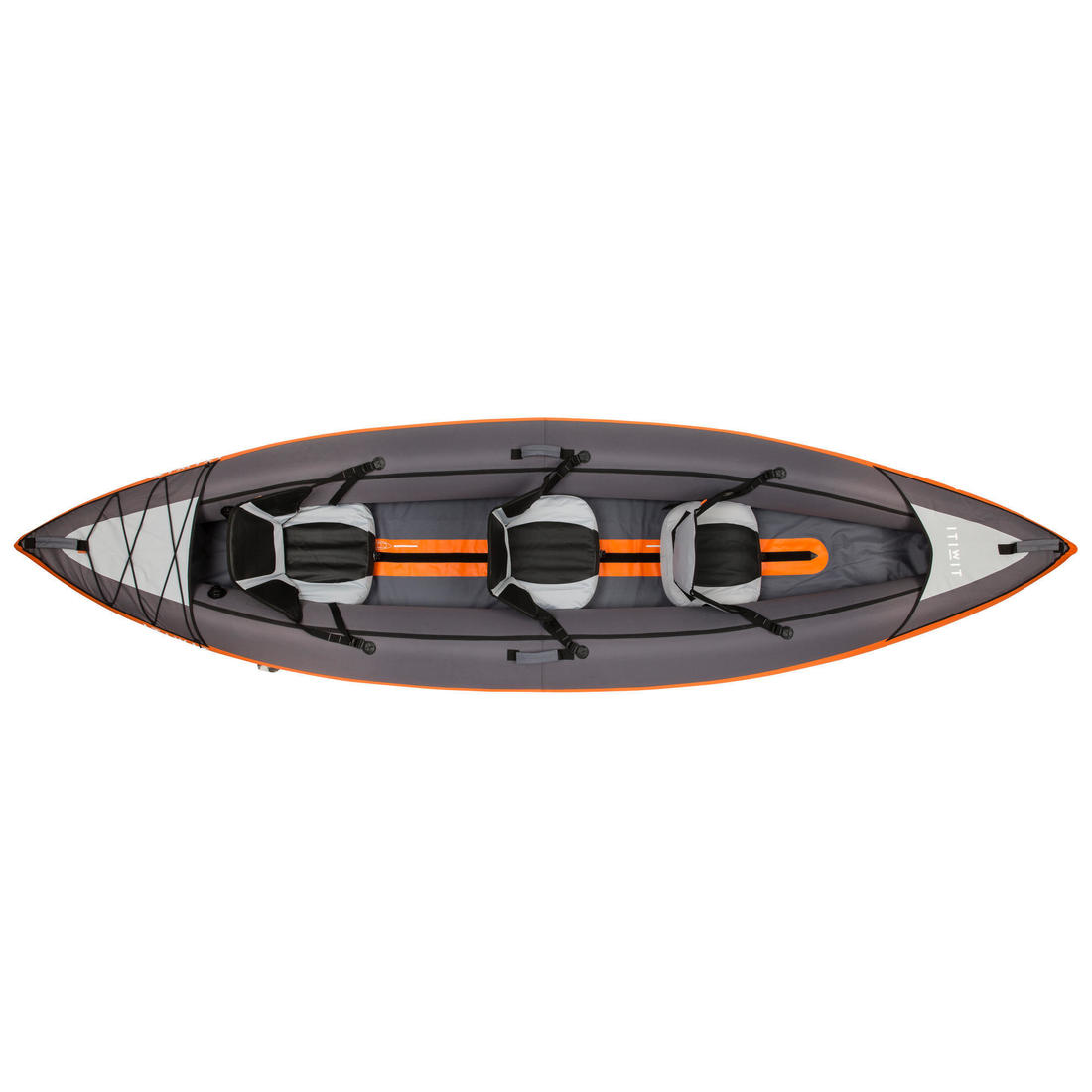 Asientos altos delante y detrás para un mayor confort para los adultos en posición de remo. Los asientos se colocan en función del número de personas embarcadas, justo en los dibujos impresos en el suelo: Delante de los dibujos "2+1" (que permanecen visibles) cuando embarcan 3 personas. Delante del dibujo "2" cuando embarcan 2 personas.