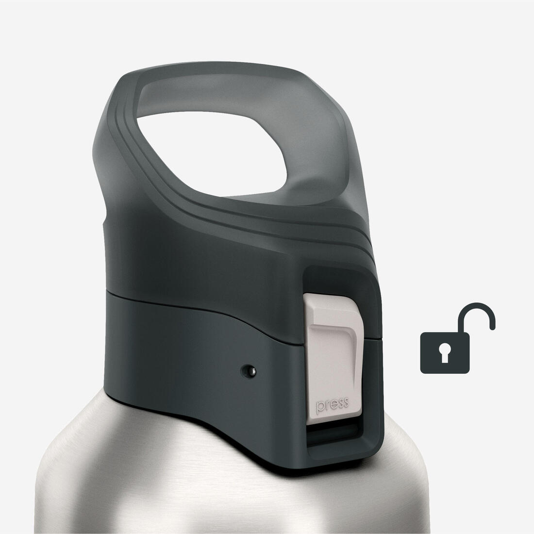 El tapón se abre fácilmente con una mano al pulsar el botón blanco donde dice "PRESS". Durante el transporte, puedes bloquear este botón desplazándolo hacia abajo. Verás una marca roja que indica que el tapón está bloqueado. El tapón incorpora un filtro para filtrar alimentos como hierbas de las infusiones o hojas grandes de té. No es adecuado para tés muy finos.