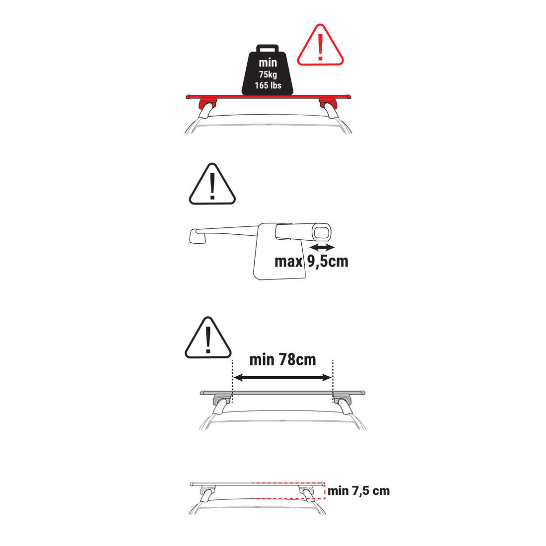 Compatible con barras de techo certificadas para carga superior a 75 kg (peso dinámico). La anchura útil es 78 cm, la distancia entre el techo y la parte superior de la barra de techo debe ser superior a 7.5 cm y la anchura del tubo de la barra de techo debe ser inferior a 9.5 cm (ver los esquemas en las fotos de esta ficha de producto). Comprueba el apriete de las barras de techo y de la casa de campaña cada vez que vayas a utilizarla. No es compatible con las barras de techo longitudinales.