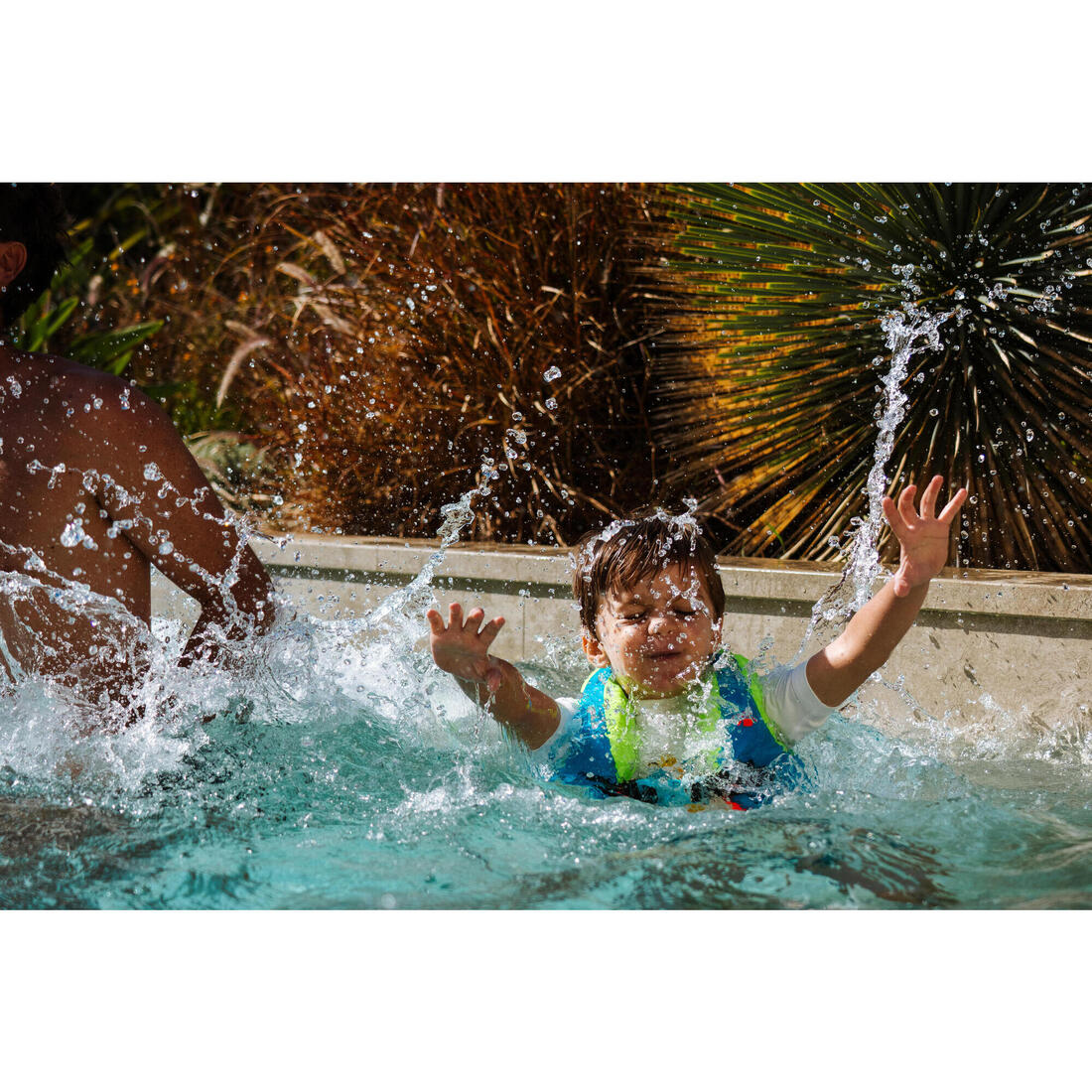 Este chaleco no es un chaleco salvavidas, es un chaleco para aprender a nadar. Es importante ajustar adecuadamente el chaleco cuando el niño lo lleve puesto para evitar las rozaduras. Respetar bien las indicaciones señaladas en el interior del chaleco. Usar bajo vigilancia constante de un adulto que sepa nadar.