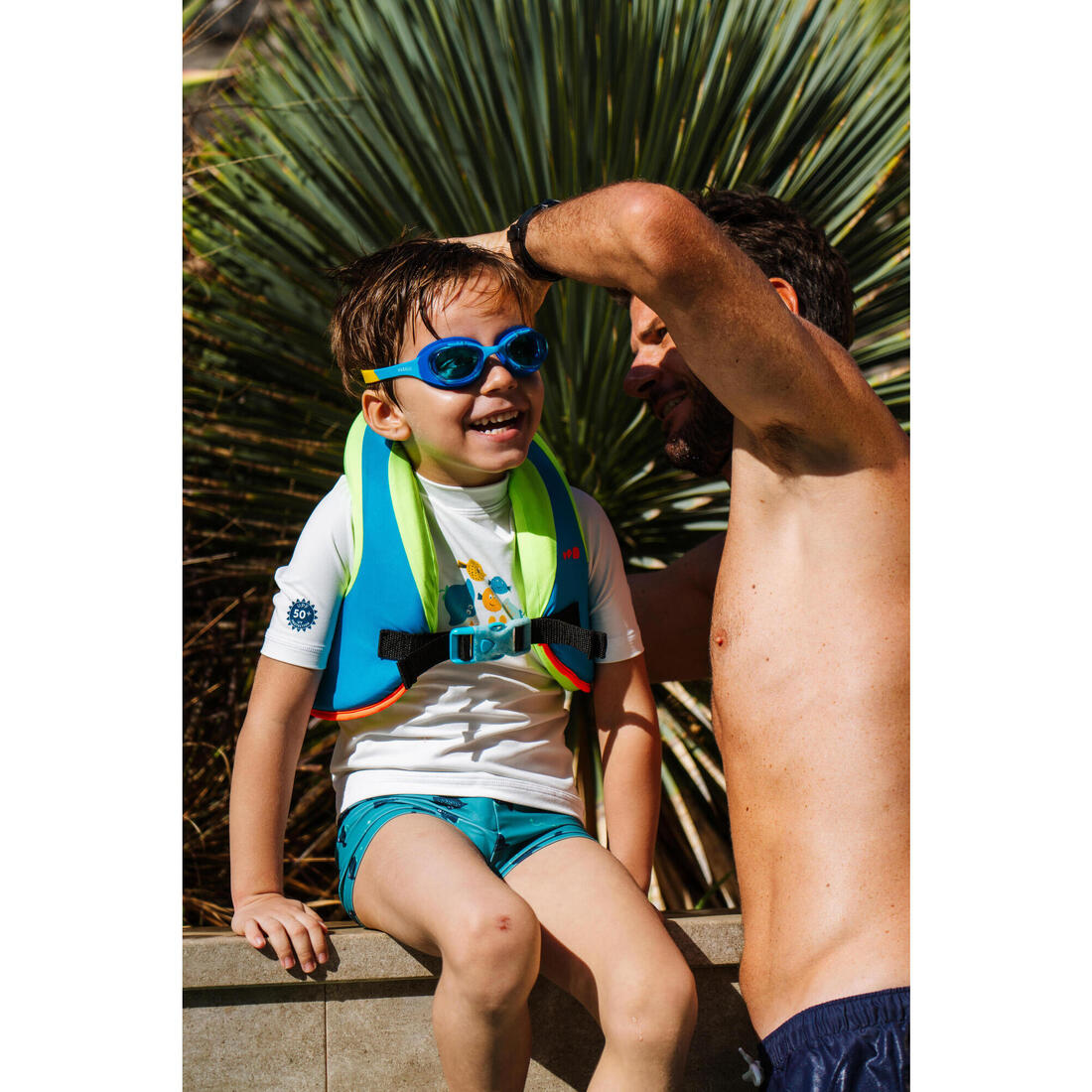 El diseño de este chaleco aumenta la libertad de movimientos para aprender a nadar. Tiene una hebilla con 3 puntos de seguridad. Usar bajo la supervisión de un adulto.