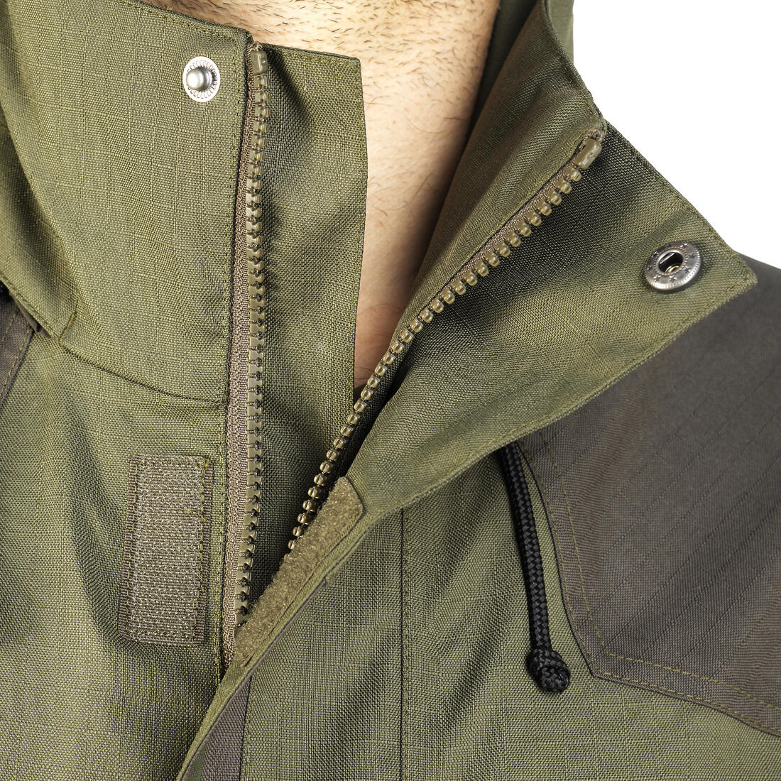 La chamarra cuenta con una capucha que se guarda detrás del cuello mediante una tira autoadherente. Se abre y se cierra con una cremallera grande delantera y con una tira autoadherente. El bolsillo interior en la parte superior izquierda es para guardar la licencia de caza o cualquier otro documento y los dos bolsillos grandes, que se cierran con 2 cierres de presión, son para los cartuchos. Por último, el morral para llevar la presa está detrás y se abre con tira autoadherente.