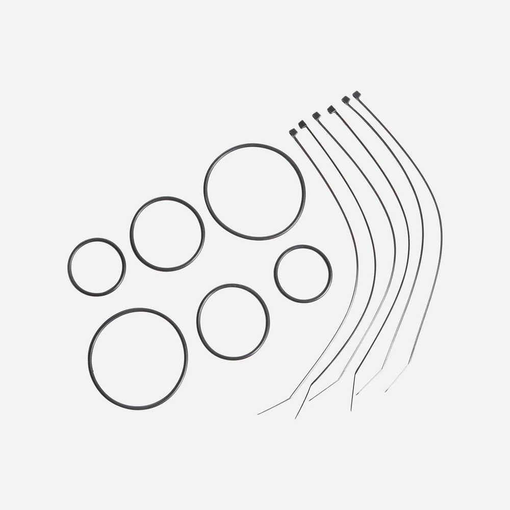 - 6 abrazaderas de ajuste (2 mm x 170 mm) - 2 elásticos de caucho de 3 cm de diámetro - 2 elásticos de caucho de 4 cm de diámetro - 2 elásticos de caucho de 6 cm de diámetro
