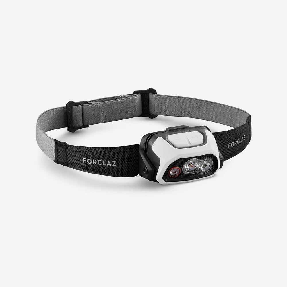 La linterna frontal FORCLAZ HL900 USB dispone de 3 haces. Haz de luz roja, muy ancho para ser discreto y ver a muy corta distancia (refugio). Haz ancho de luz cálida para ver bien hacia adelante y a los lados a corta y media distancia. Haz de luz concentrado de luz fría para ver lejos.