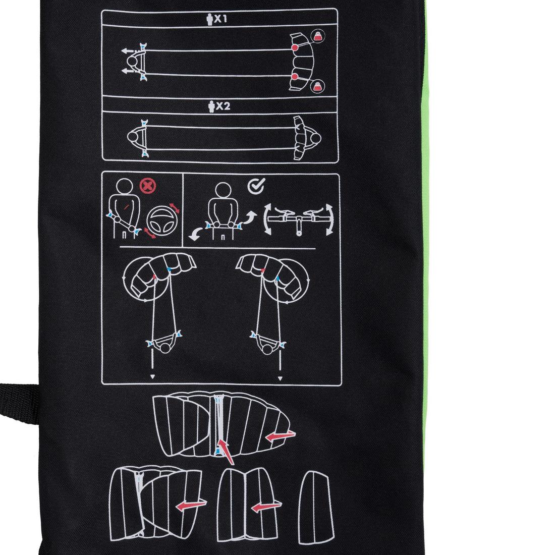 ATENCIÓN, CON VIENTO FUERTE, LA TRACCIÓN DEL PAPALOTE PUEDE SER MUY POTENTE. SIEMPRE ES PREFERIBLE ADAPTAR EL USO DEL PRODUCTO A LAS CONDICIONES METEOROLÓGICAS, A LA TALLA DEL USUARIO Y A SU NIVEL DE PRÁCTICA. Comprueba regularmente el estado de tus líneas "Dyneema" 110 kg.