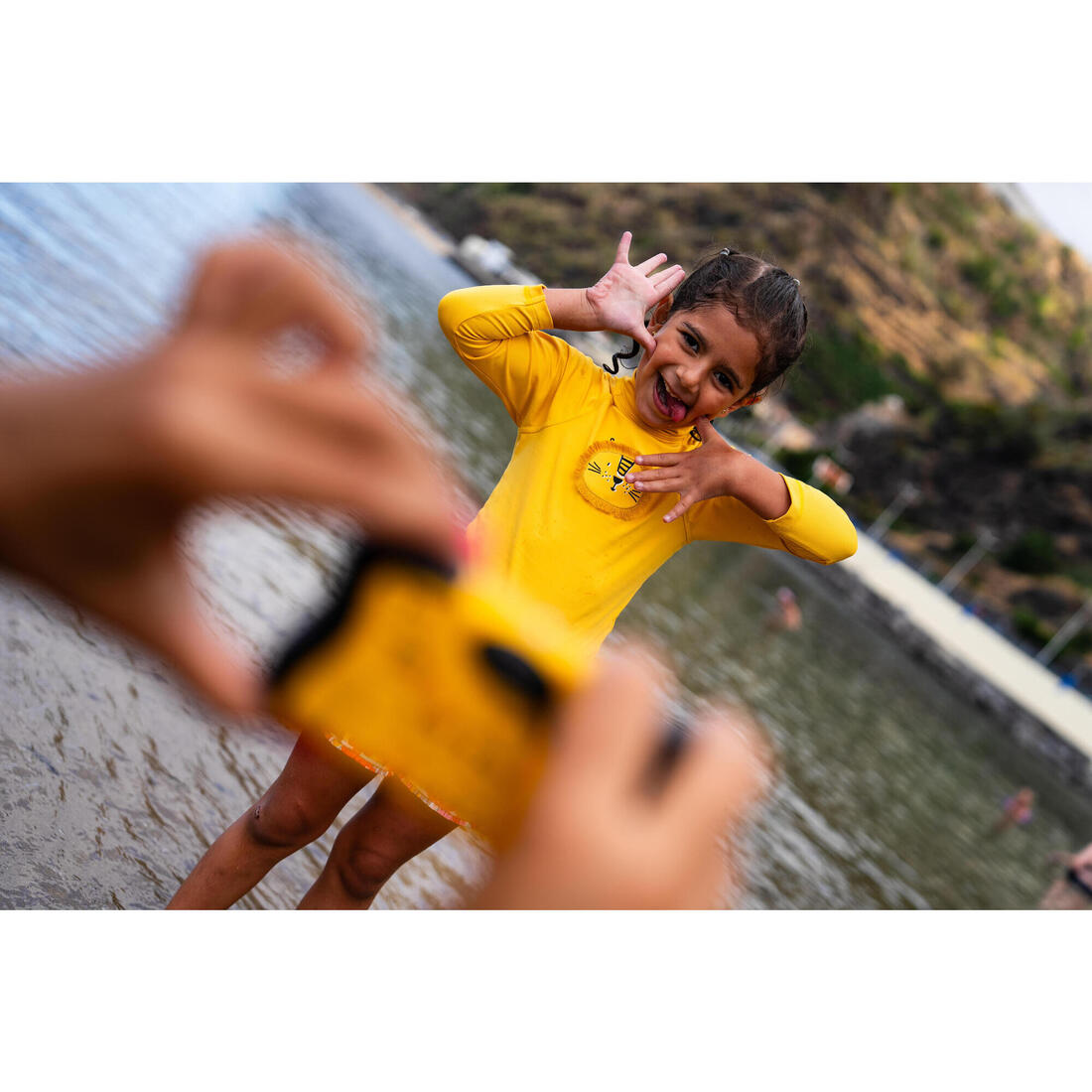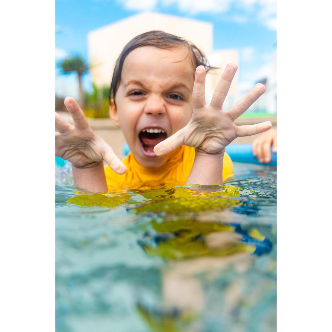 Esta camiseta anti-UV protege a tu hijo/a de los rayos UV incluso en el agua con la máxima cubrición. Se pone fácilmente gracias a los botones de presión de detrás del cuello.
