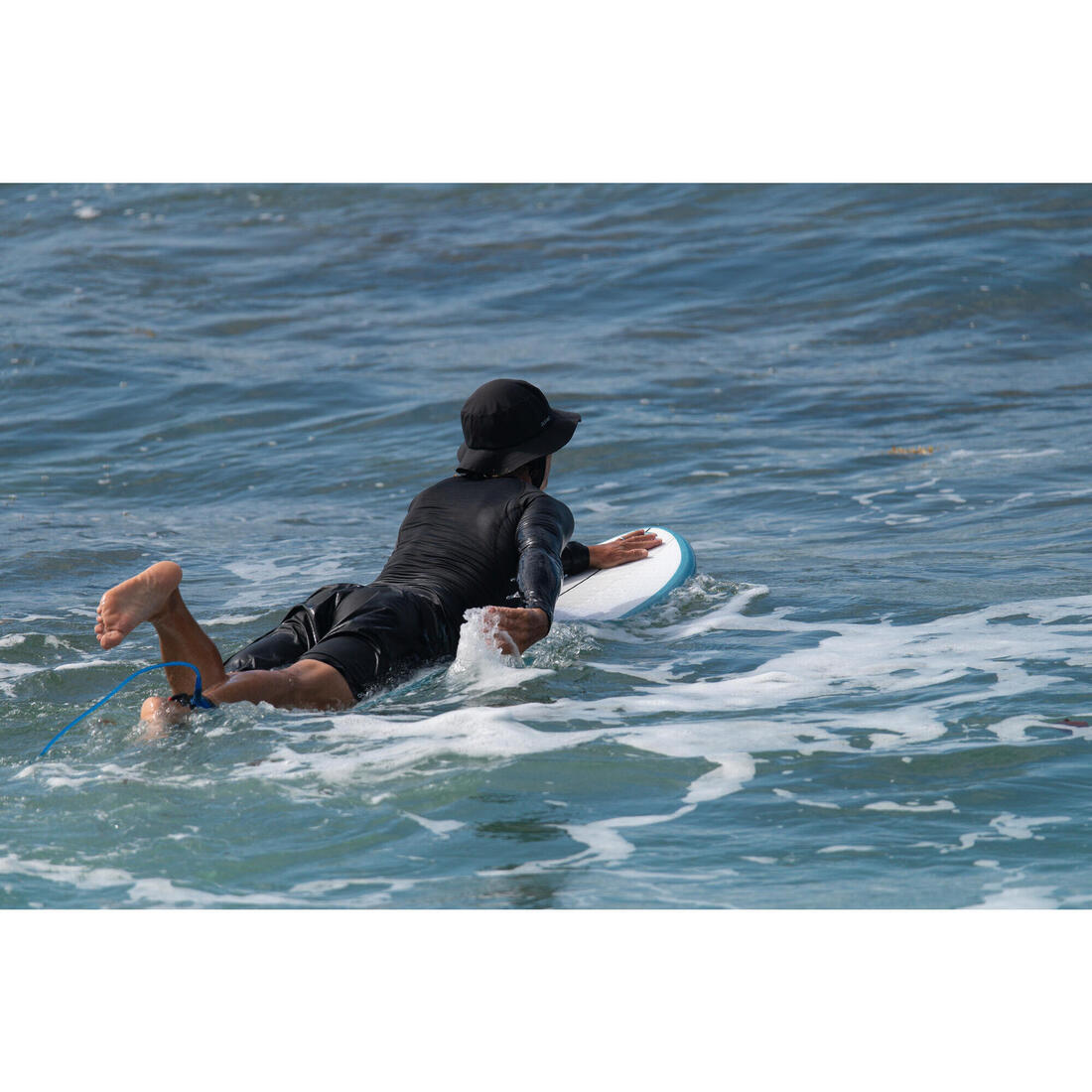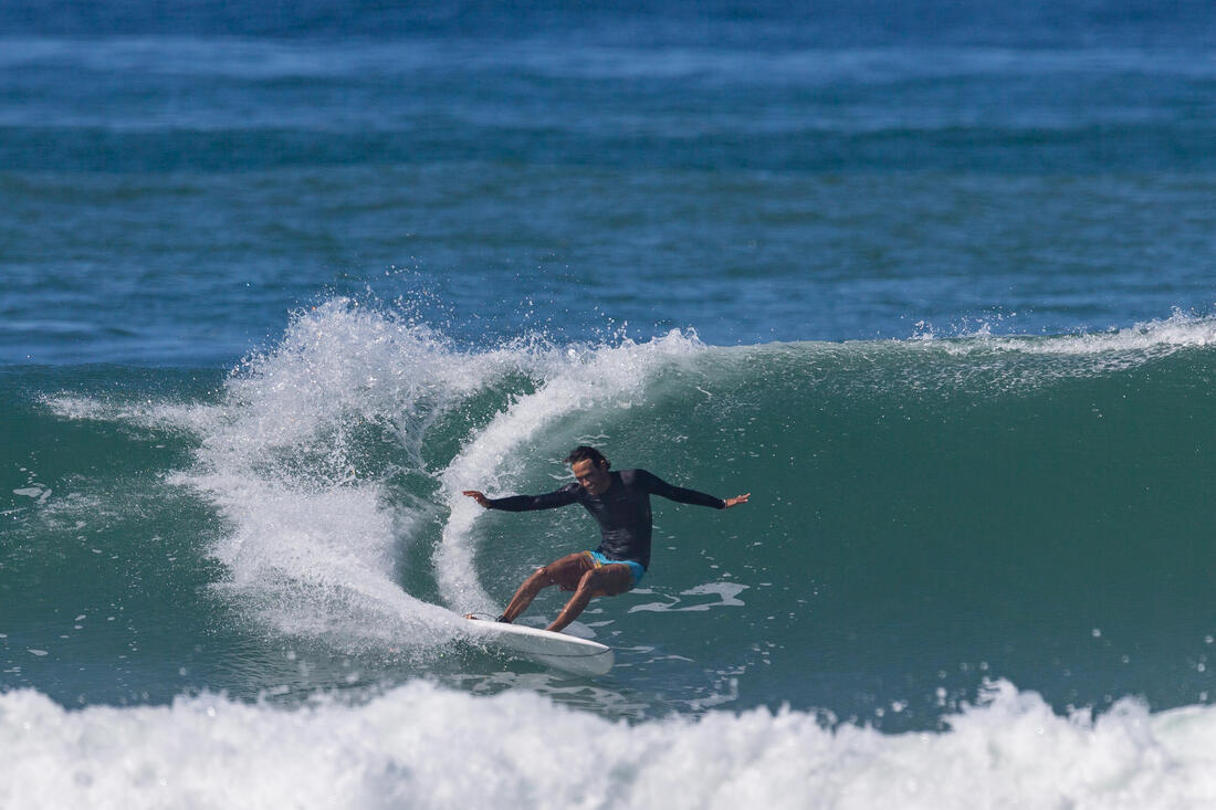 Playera anti-UV de manga larga, para protegerte del sol y limitar las irritaciones por contacto con la tabla. No se mueve, pues en la cintura cuenta con un innovador sistema de sujeción en las olas.