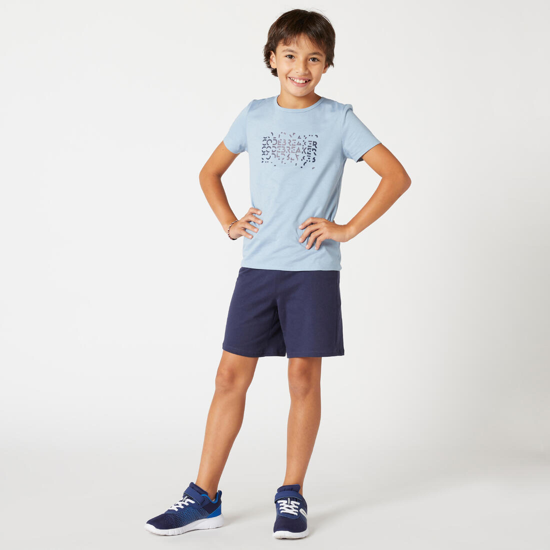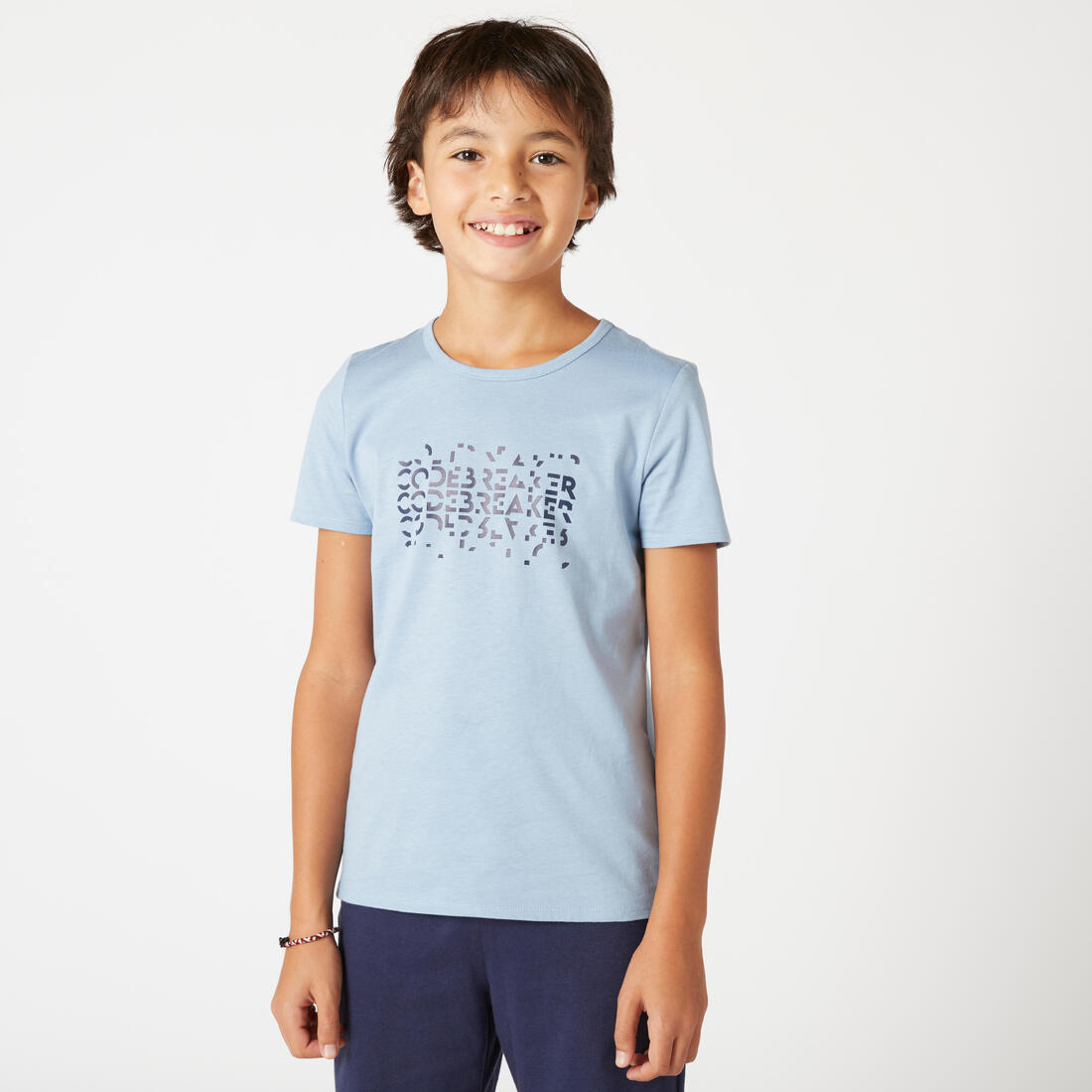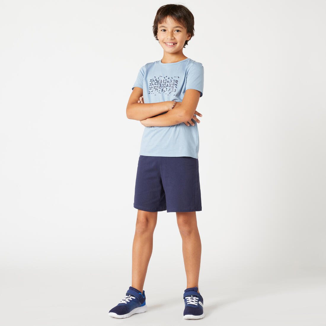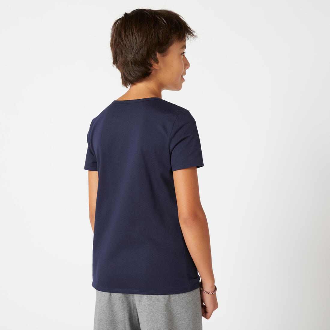 Nuestro modelo lleva la playera de manga corta 100 en talla 10-11 años, y mide 1.44 m.