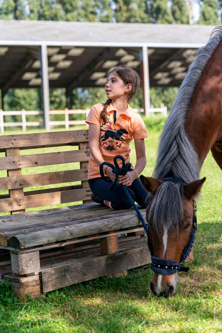 Polo de equitación 100 muy cómoda, acompaña tus movimientos a caballo y cubre bien la espalda. Muy elegante por el cuello y las costuras a contraste, el motivo impreso ¡te encantará!