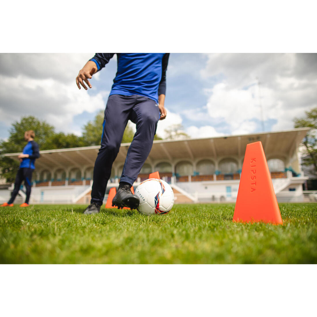 Dependiendo de la edad, los conos permiten balizar, delimitar o esquivar. David, entrenador y responsable de pruebas en Kipsta, te lo explica: "Los niños pueden utilizar los conos grandes para balizar el terreno: aportan puntos de referencia visuales muy importantes. También pueden utilizarlos para simular 2 porterías pequeñas o una puerta durante el juego. Los adultos pueden utilizar los conos grandes como obstáculos: como su tamaño es más grande, tienen que esforzarse más para esquivarlos".