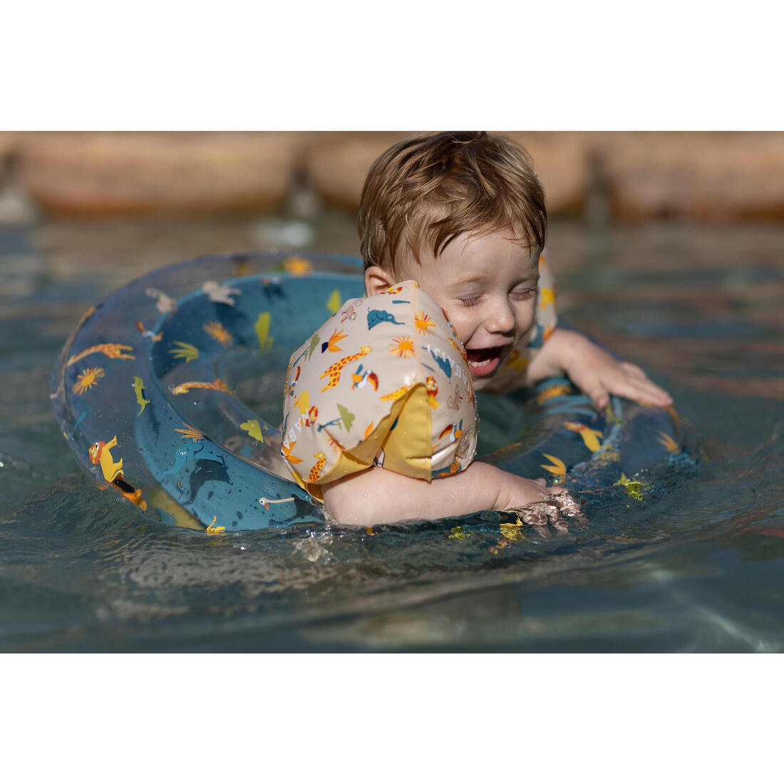 Después de usarlo, enjuaga siempre el salvavidas con agua limpia para quitar el cloro, la arena o la sal. Para evitar una decoloración prematura, cuando no se esté utilizando, no lo dejes a pleno sol.
