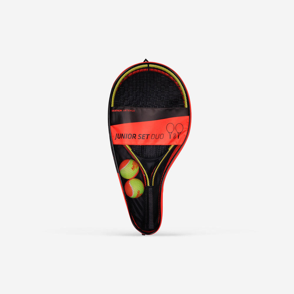 Este set contiene: - 2 raquetas junior TR100 JR de 21". - Dos pelotas TB110 naranja lentas, con una reducción de la altura del rebote del 50%, conforme a las normas de las federaciones internacionales. - Una minibolsa para el transporte y la organización con una correa ajustable.